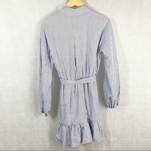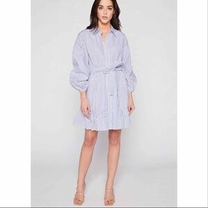 Cinq a Sept Kelly long sleeve stripe belted mini shirt dress in size 8. New with tags, never been worn. This was exposed to a retail environment and therefore has a surface dirt as pictured ( second pic from the last) I was able to get most of it but it should come out after washing. V neck, collared, long sleeves, front button closures, A line silhouette, front tie waist, ruffled hem, all over stripe, fully lined. True to size. Measurements are approximates only. ** only reasonable offers are considered.