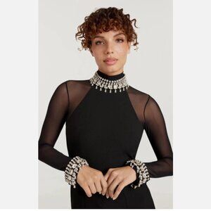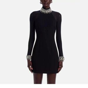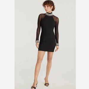 Be the star of any special occasion in this Crystal Trim Loretta Dress. The body-hugging silhouette accentuates your curves, while the black mesh sleeves add a touch of glamour. The embellished neckline and cuffs make this mini dress perfect for any special event. Stand out and shine in this must-have dress.