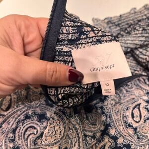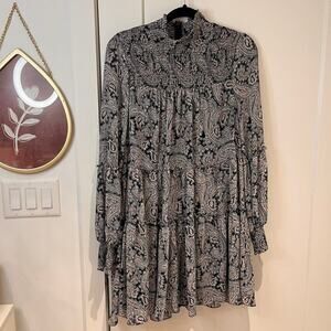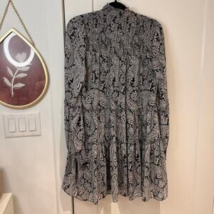 Cinq a Sept women’s size 0 Rika Dress in a navy multicolored paisley swirl print. It features a back zip closure with turtleneck style and long balloon peasant sleeves. It is semi sheer, but is lined. Near the top of the neckline is smocked as well.