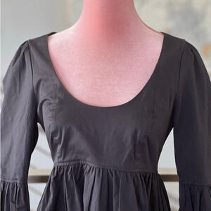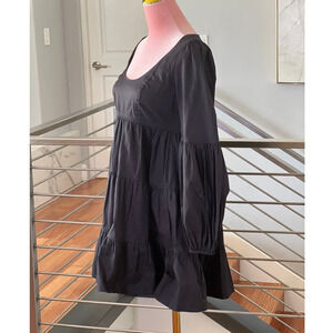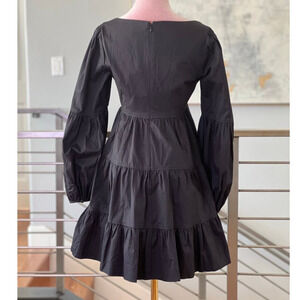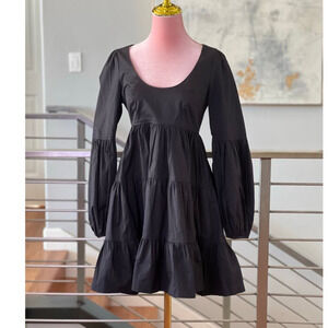 This NWT Cinq a Sept Rose Tiered Mini Dress features a scoop neck, long bishop sleeves with button cuffs, an empire waist, a tiered ruffle skirt, and side slit pockets.