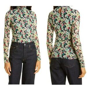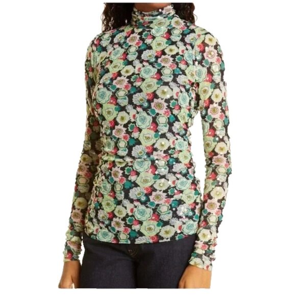 Cinq a Sept Sequin Embellished Shirred Mesh Turtleneck Top Long Sleeve Green S