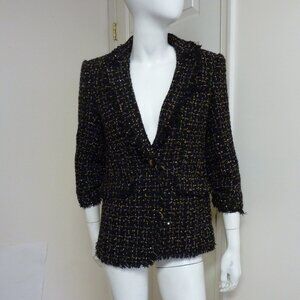 A wool-kissed blazer is shot through with shimmer and cut from fringe-finished tweed.