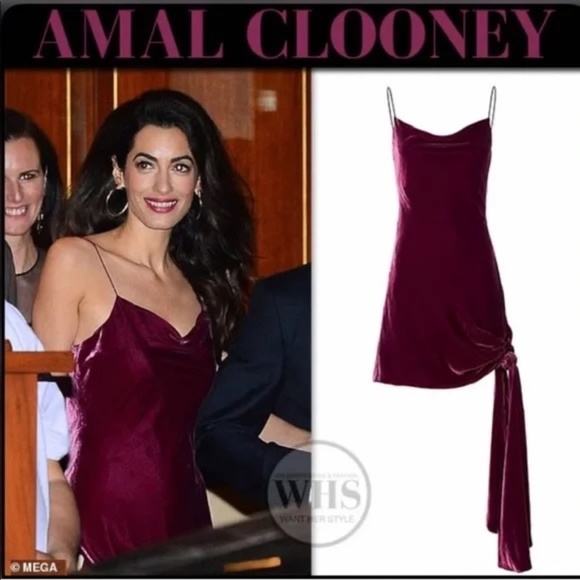 Features: A stylish side knot detail gives distinctive style to this gathered velvet dress. Cowl neck. Spaghetti straps. Merlot/gooseberry Self: 82% rayon, 18% silk Contrast Fabric: 100% silk Lining: 95% poly 5% spandex Dry clean only Fully lined Draped fabric neckline Hidden side zip closure Knot tie accent at hem - As seen on Amal Clooney and on the Bold & the Beautiful- Gala - Prom- Formal- Vegas