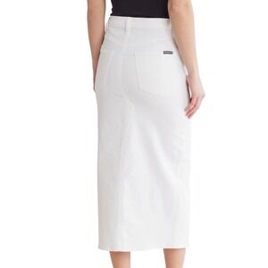 Chic and sophisticated midi skirt in a crisp white denim. The streamlined silhouette features a flattering high waist and a sleek, elongating front slit for ease of movement. Classic five-pocket styling adds a touch of casual cool, while the midi length makes it versatile for both day and night. This skirt is the perfect statement piece for brunch dates, evening outings, or stylish everyday wear.