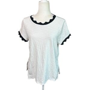 Elevate your wardrobe with this chic white top featuring stylish black scallop trim. Perfect for any occasion, this top offers a blend of comfort and elegance.