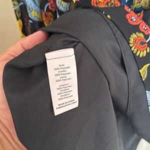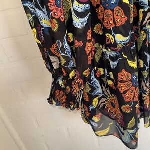 Vibrant floral patterned blouse with long sleeves. Features a mix of red, yellow, blue, and green colors on a black background.