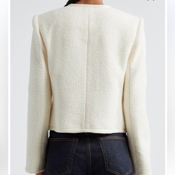 Cut from exceptionally soft and luxurious teddy bouclé, this jacket is with glistening rhinestone buttons is a chic way to step into the scene.