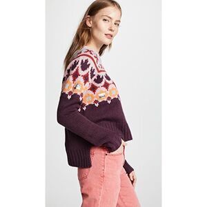 A sequin-studded Fair Isle pattern beautifully frames the face in this cozy wool-kissed sweater knit with dropped shoulders and a slightly cropped step hem.