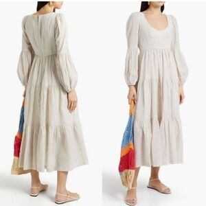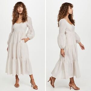 Stunning and oh so flattering cotton long sleeve midi dress from Cinq a Sept, in a size 4. Featuring scoop neckline, hidden back zipper, half slip lined skirt, tiered full skirt, and button cuffs.