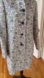 Vintage Like new!!! coat features a high stand-up collar, long sleeves, and a front button closure with dark blue /navy buttons. The pattern consists of a repeating motif of navy stylized flowers and leaves on a white background.