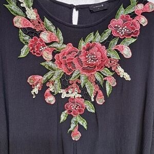 good condition, round neck, multi colored floral design, 3/4 length bell sleeves with ties, rounded hemline, keyhole back, 100% rayon, pit to pit 22" sleeve 17" length 22"