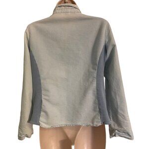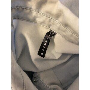 Cirana Womens Size Medium Washed Blue With Side Stretch Knit Tie Waist Top. Snap button down front. Roll tab sleeves. Blue with stretch knit sides. Tie Waist. Western. 20" across chest with stretch to over 22" . 23" lenght. Great used condition !! No stains or rips.