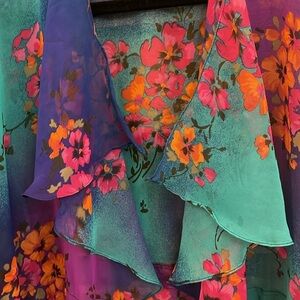 Circa 2000 purple, blue, pink and orange swimait coverup with ruffles. Large