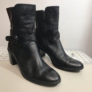 Circa Joan & David CJMontLake Black Ankle Boots are in a buttery soft leather with a 2.5” chunky heel. The inner side with a 7.5” zipper with logo and outer ankle base has a decorative strap with buckle closure. A Very nice comfy boot! EUC