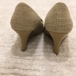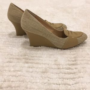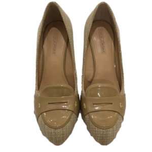 Neutral ladies Classic Patent leather/cloth wedge shoe. Sz 8.5, regular width. Extremely comfortable! A great tailored work shoe! Very good condition Wears well will dresses, skirts & jeans