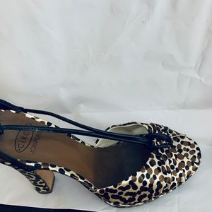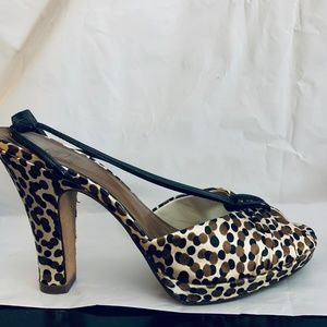 Brand new never used fabric sandal comes with dust bag, Leather bottom, brand new never worn. 1/2 platform shoe size 5.5. 3" heel
