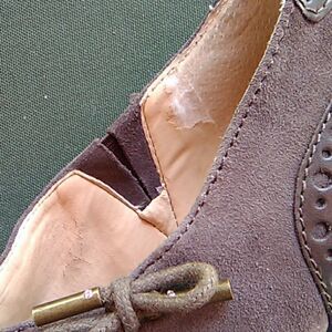 Style: Eunice. Deep taupe in the softest leather. Spectator style with perforated suede detail. Elastic vent on the inside, tie on the outside. Uppers are in perfect, like new, condition. Hardly any wear on the sole. Lining of left shoe has some cracking, but you won't see this, and it is butter soft. Size 8.5 measures 3 3/8 wide, 11.5 long, 4.25 high. You will love these, and they come in their original box.