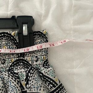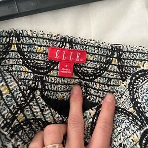 This skirt features a striking black and white pattern with hints of blue and yellow, perfect for any occasion. Its unique design adds a touch of sophistication to your wardrobe.