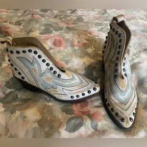Stylish ankle boots with intricate blue stitching. White leather with black stud accents. Perfect for a chic look.