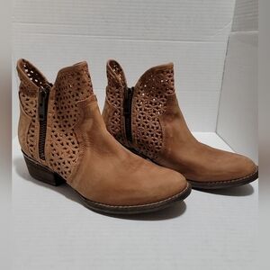 Circle G Women's Cutout Booties - Round Toe Tan Leather 10M. Double-Sided zips but only inside zipper works. Beautiful leather. One shoe on back has a lift of the cut out but no hole, the leather on inside of boot is intact.