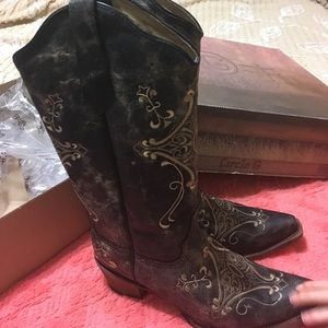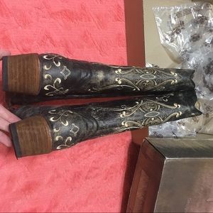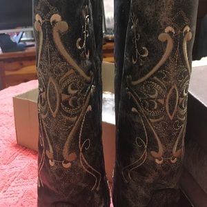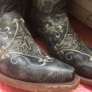 Distressed leather with embroidered detail - super cute. I wore them to one event for a few hours and they've been in the box since soooo I'm selling them