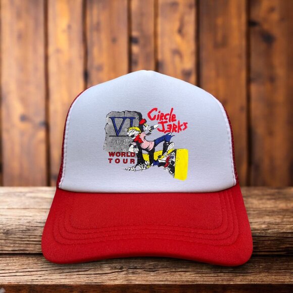 Circle Jerks World Tour 1987 Mens Trucker Hat Red Snapback 80s Hardcore Punk Cap