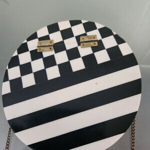 This bag is from UAE and has never been worn. It is a circle bag with stripe and check print. It has a gold metal latch to open and a gold metal chain. Made of wood. 7.5 inches length and width. Can fit an i-phone vertically.