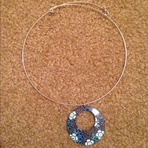 Circle pendant necklace. Brown with white dots and white and blue flowers.