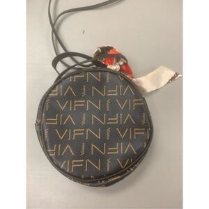 Ladies super cute brown and tan monogrammed circle shaped vegan leather Crossbody bag. Excellent condition. Approximately 7" width 7" height.
