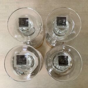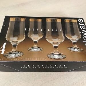 Brand new set of 4 wide gold-rimmed glass goblets in ‘Versailles’ pattern from Circleware. Each all-purpose goblet has 10-ounce capacity and measures approximately 7-1/2” tall x 2-7/8” diameter. Made in Turkey. Brand new with tags in original boxed packaging.