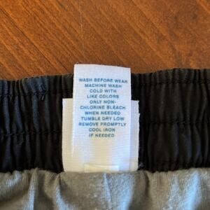 Black woven pants lined with gray knit, pull on, elastic waist, front pockets