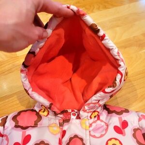 Gently used. No flaws noted. slight discoloration at wrist. Zipper closure covered with velcro so babe doesn't undo it. elastic at wrists. fleece Lined hood. Front pockets. Size 18 months. Pink Floral design.
