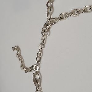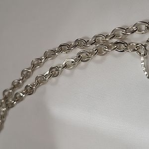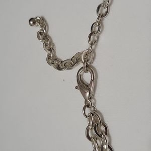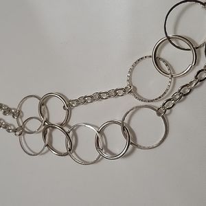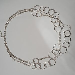 This necklace is pale silver double chain necklace. The highlight if this necklace is the bottom half which includes various circular chains with different textures.