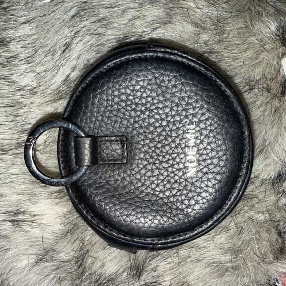 Noemie Black Leather Circular Coin Pouch with Keychain. This compact coin pouch features a grained black leather exterior with a circular shape and a secure zipper closure. Perfect for organizing coins or small essentials, it also includes an attached keychain for added versatility. In excellent pre-owned condition, with minimal signs of wear. Keep your change organized in style with this chic and practical accessory.