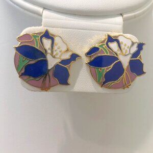 -Circular Gold Tone Blue Pink Floral Boho Stud Earrings Pre-Owned.