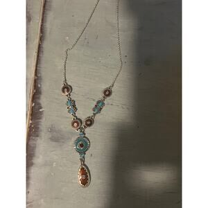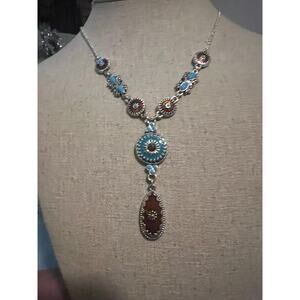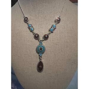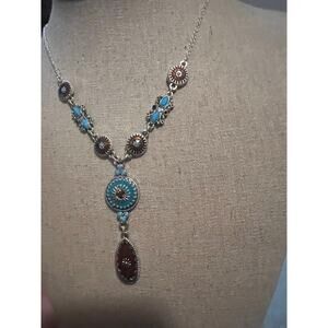 Circular and Teardrop Shape Necklace with Burgundy and Teal Enamel Red Stones. Add a touch of elegance to your jewelry collection with this unique necklace!