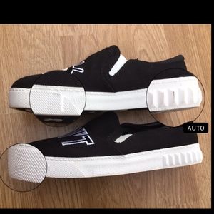 Black canvas with white trim slip on loafer sneakers. Slight platform 1" heel. Excellent whimsical embroidered top “👁 can’t” design!