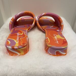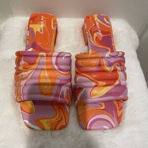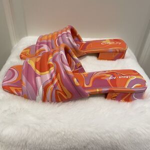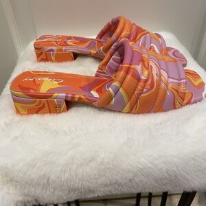 Beautiful, colorful orange and purple, slip on, slides, sandal.