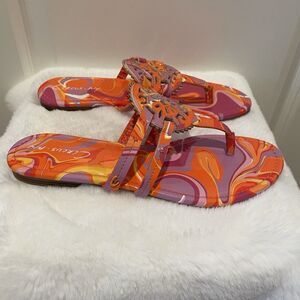 Beautiful, Bright, Colorful tie dye Orange and purple, flat, thong , slip on, laser cut medallion, vinyl patent material.