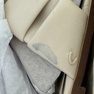 GUC Inara Sandals from Circus NY by Sam Edelman in Ivory. These slide sandals have a synthetic upper with a folded design that is inspired by origami. It's complete with a square toe and a lightly padded footbed. You can see in the photo that there is a slight discoloration on the side of the leather near the sole. Worn less than 10 times. Packed and stored in original box.