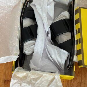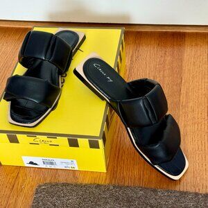 Inara Sandals from Circus NY by Sam Edelman in black. These slide sandals have a synthetic upper with a folded design that is inspired by origami. It's complete with a square toe and a lightly padded footbed. Packed and stored in original box.