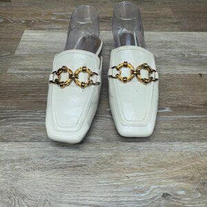 The Circus NY by Sam Edelman Taryn Square Toe Tailored Mules in Women's Size 8.5 are elegant and stylish flat shoes perfect for any fashionable woman. These ivory mules feature a square toe design and slip-on closure for easy wear. The gold rings across the vamp add a touch of glamour to the faux leather upper material, making them a chic and versatile addition to any wardrobe. Made in China, these shoes combine quality craftsmanship with a trendy and sophisticated style.