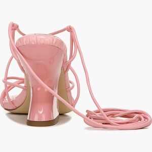 Svelte laces weave up and around your ankle in a stunning sandal set on a bold, architectural heel.