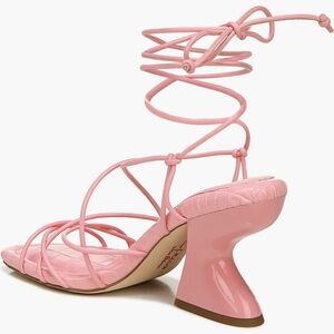 Svelte laces weave up and around your ankle in a stunning sandal set on a bold, architectural heel.