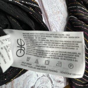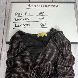 The Circus Ny Blouse is a colorful and lively top perfect for a date night. This size M blouse features a striped pattern with a hint of glitter metallic lurex, adding a touch of sparkle to the multicolor design. Made from a blend of nylon, metallic and spandex, this blouse offers a comfortable and flattering fit with long sleeves and a stylish V-neckline. Ruching to front,back, sides and arms. The playful and vibrant theme makes it a fun and eye-catching choice for women looking to stand out.