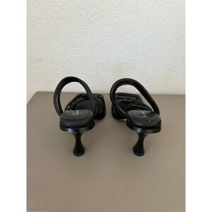 These sandals are a perfect closet staple. They come in classic black and feature an open square toe style. The contemporary intertwined straps give it a stylish appeal. Perfect for dressing up or down. The shoe has a lovely padded footbed. These were an overstock item so they are new but do not have a box and there might be slight blemishes, please see photos.