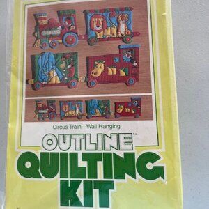 This outline quilting kit by BeeCrafty is designed to be a wall hanging, size 53" by 8". It is kit #1350, and gives directions for hand quilting. The package says that the kit contains everything needed for this project except stuffing and cording. The fabric is machine washable and dryable. The kit makes a train with an engine, 2 animal cage cars, and a caboose, and all 4 have circus animals in them. This makes a delightful wall hanging for a child's room.