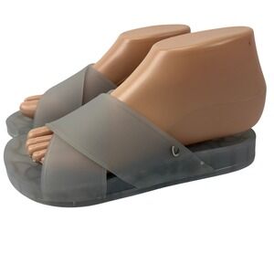 Keywords: Circus by Sam Edelman, Jaylee slides, womens size 5M, silver jelly sandals, translucent sandals, crisscross slides, pool slides, PVC sandals, slip-on sandals, cushioned insole, jelly shoes, summer slides, casual slides, beach sandals, poolside shoes, water-friendly, easy slip-on, almond toe, lightweight sandals