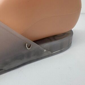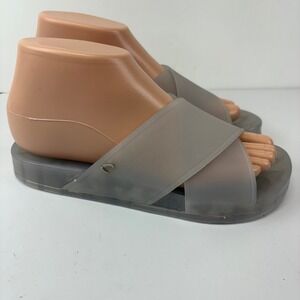 Description: Circus by Sam Edelman Jaylee women's size 5M jelly slides in silver featuring translucent PVC upper with wide crisscross straps. Almond-toe slip-on design with cushioned insole provides comfort for poolside or casual wear. 1/2" platform with manmade lining and sole. Fresh jelly sandal styling offers easy summer footwear option.