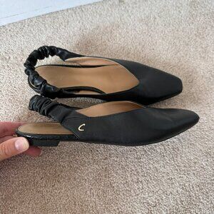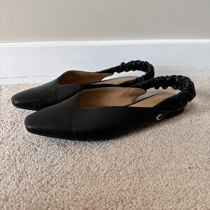 Super trendy and perfect black flat to carry you through the seasons. Features a slight square toe box, similar to a proper ballet flat and a ruched sling black strap. Faux, simple black leather makes these easy to pair with tons of outfits. In excellent pre owned condition with only minor wear. No major flaws to note. Size 6. See photos for measurements and details.